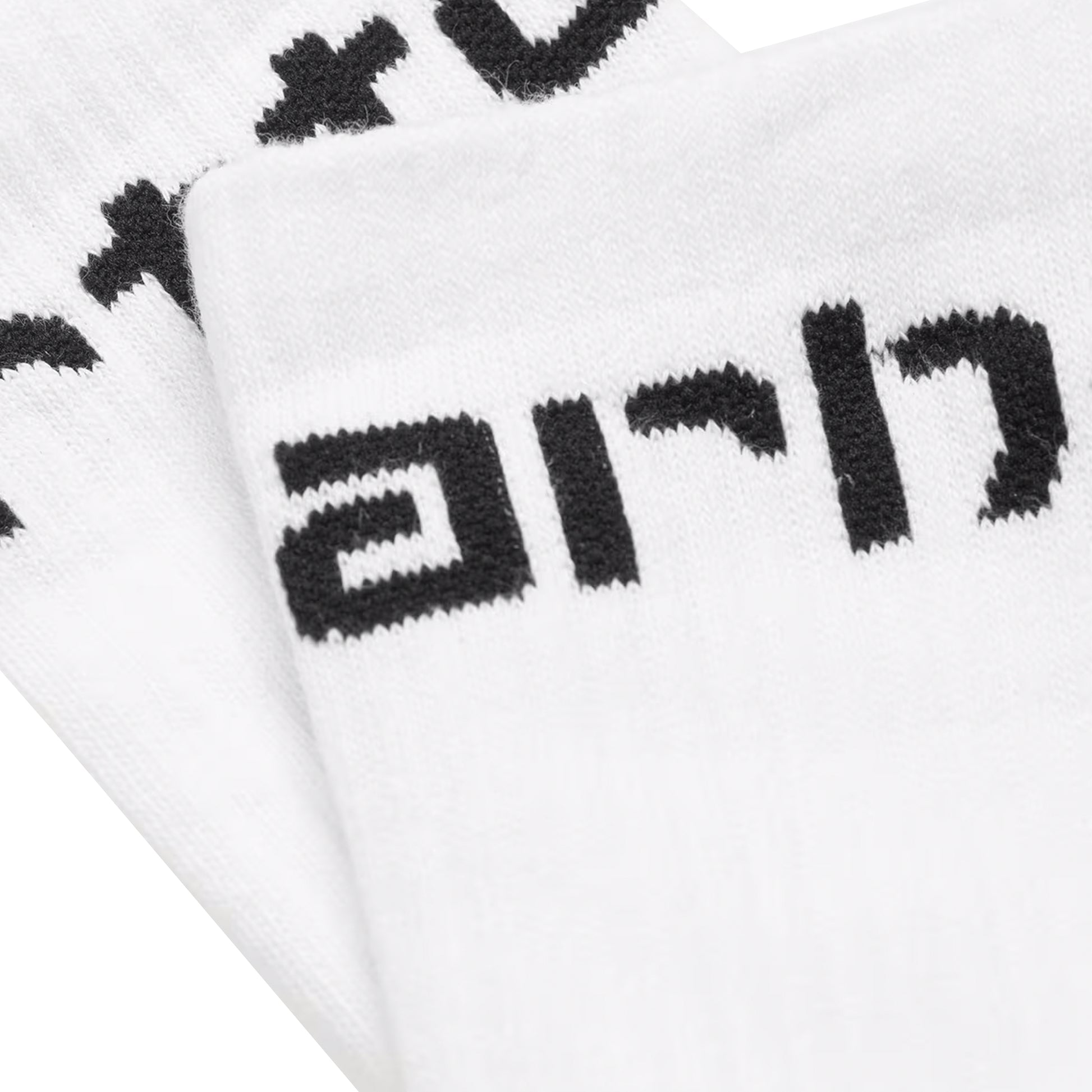 Carhartt WIP socks white / Black are Knit from stretchy cotton-rich yarn, the Carhartt socks have a textured, french terrycloth panel on the inner sole for a softer feel. they also feature ribbed stitching on the upper leg and are finished with a jacquard Carhartt WIP script logo at the cuffs.