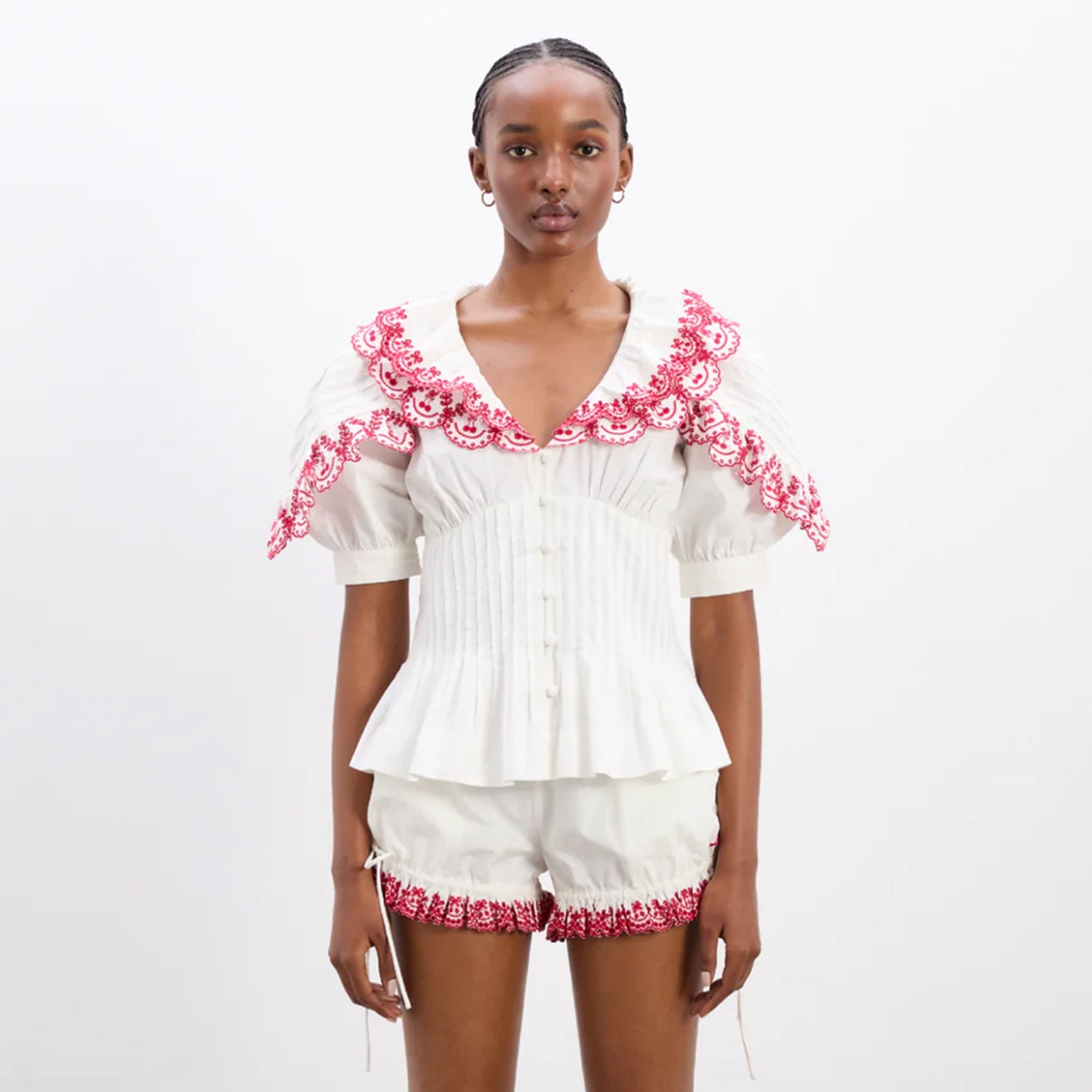 The Damson Madder Caroline Blouse is a beautiful blend of tailored elegance and feminine charm. Featuring cherry embroidery, a pin-tuck bodice, puff sleeves, and a small peplum hem, this cotton blouse is perfect for summer. Pair it with the matching Jenna Bloomer Shorts for a playful and coordinated look.