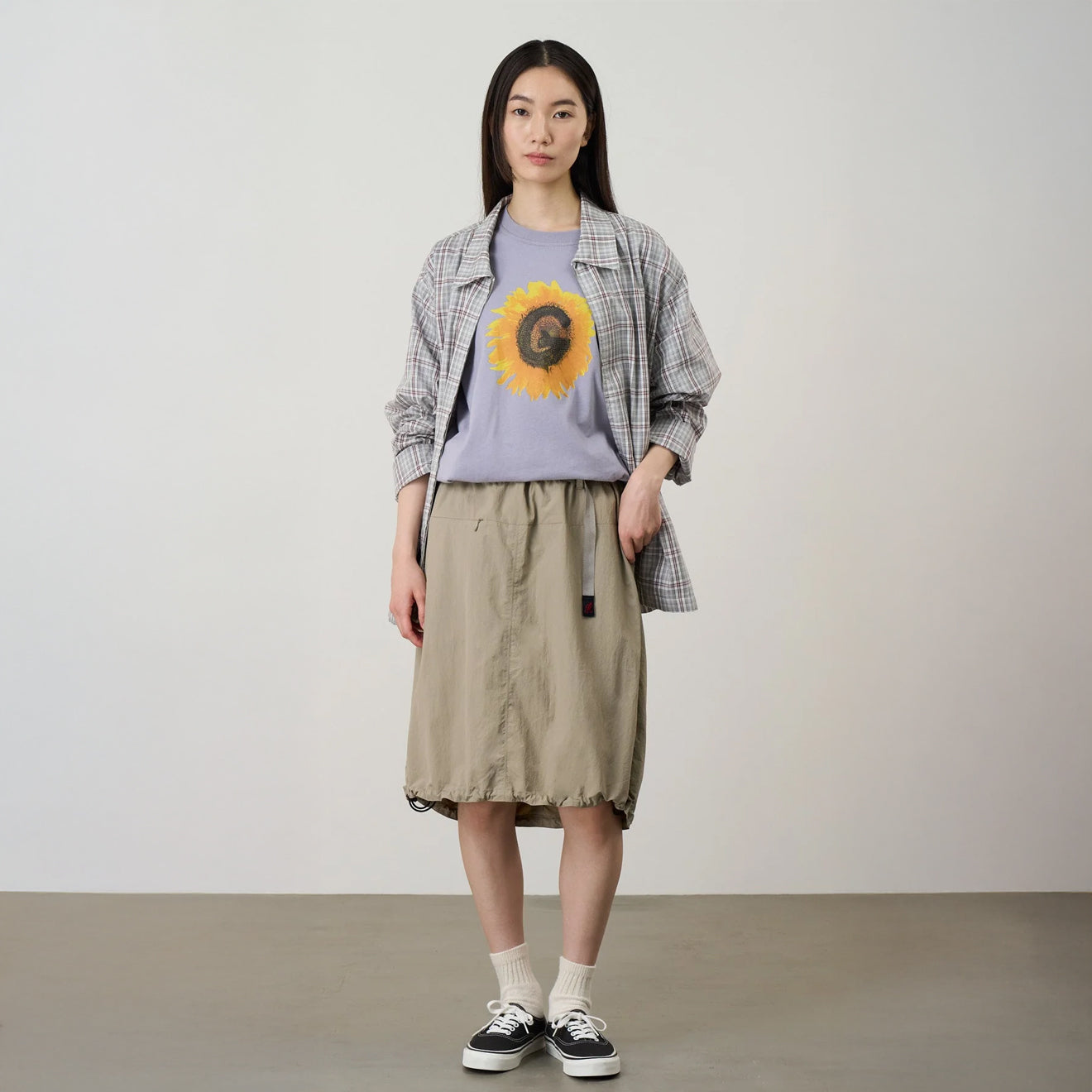 The Gramicci Womens Nylon Packable Midi Skirt Olive is a versatile skirt designed for the outdoors. Made from lightweight, durable nylon, it is quick-drying and recycled from off-cuts. The mid-length design includes an integrated adjustable belt and can be packed away easily for travel.