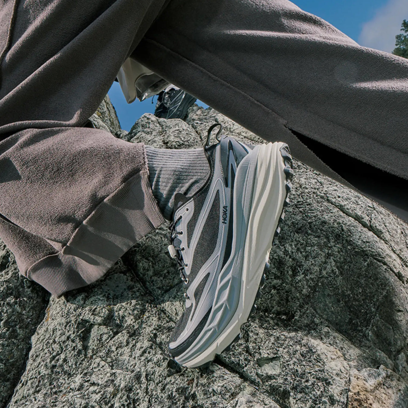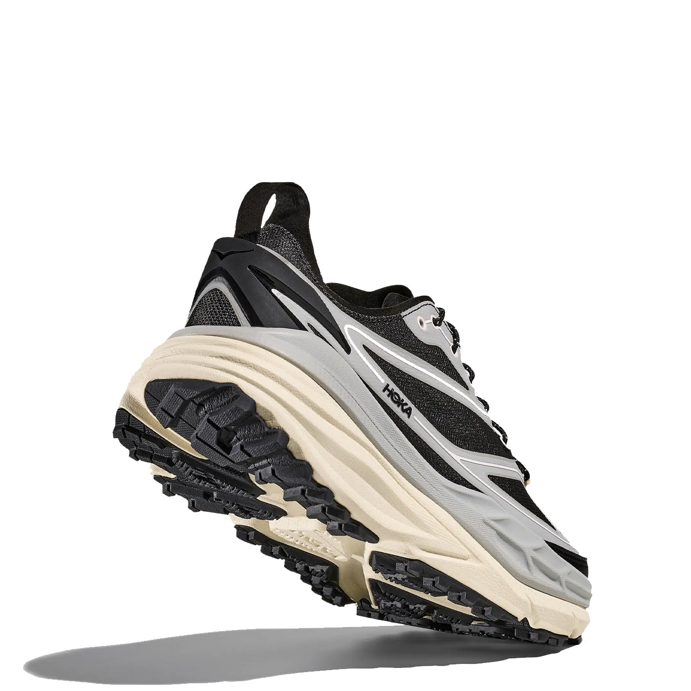 The Hoka Womens Stinson 7 Trainer in Stellar Grey and Eggshell blends trail performance with everyday wear, offering a stable and comfortable feel underfoot. Designed to move easily between outdoor routes and daily use, it combines supportive cushioning with a lightweight build. Practical details and a distinctive upper give it a considered look without sacrificing function.