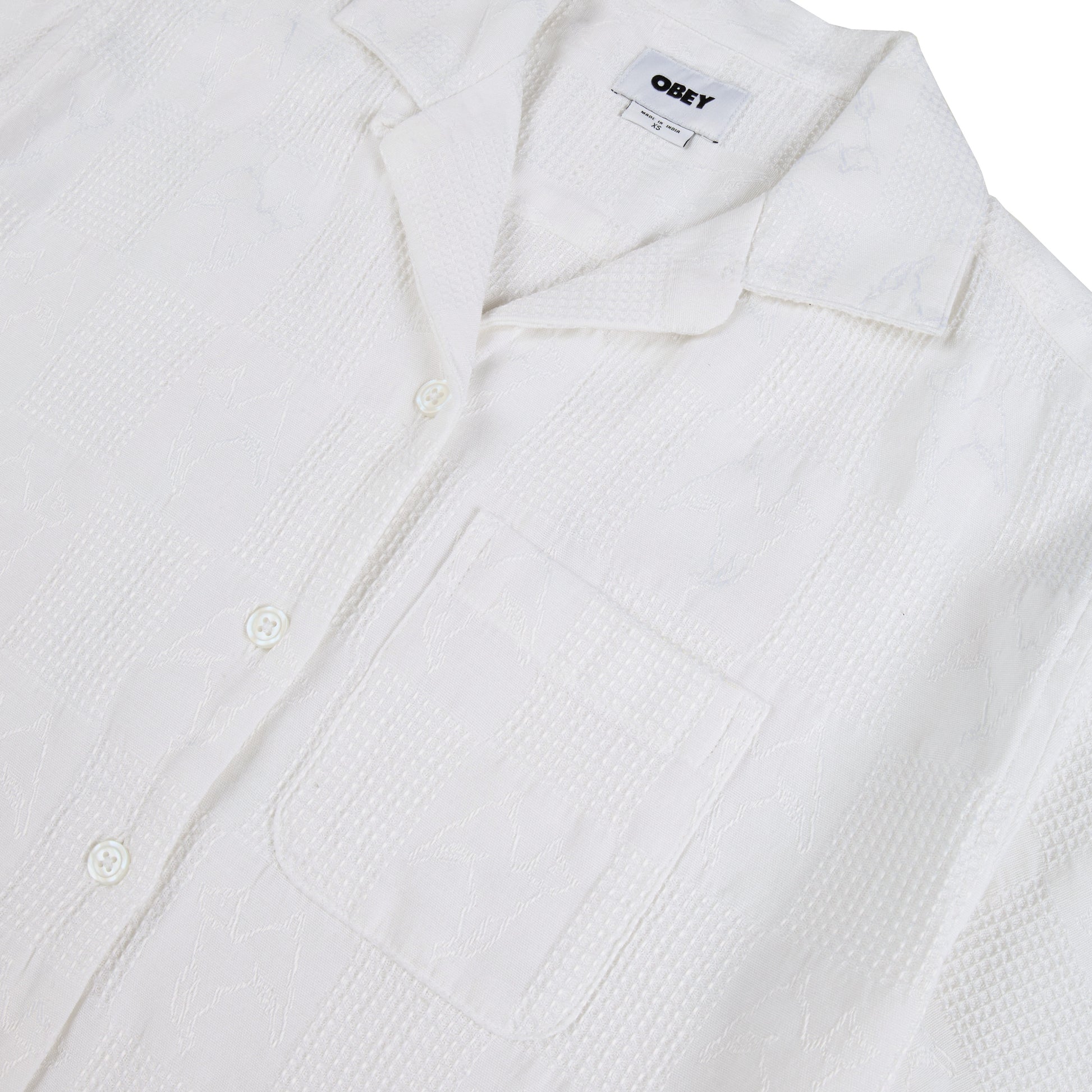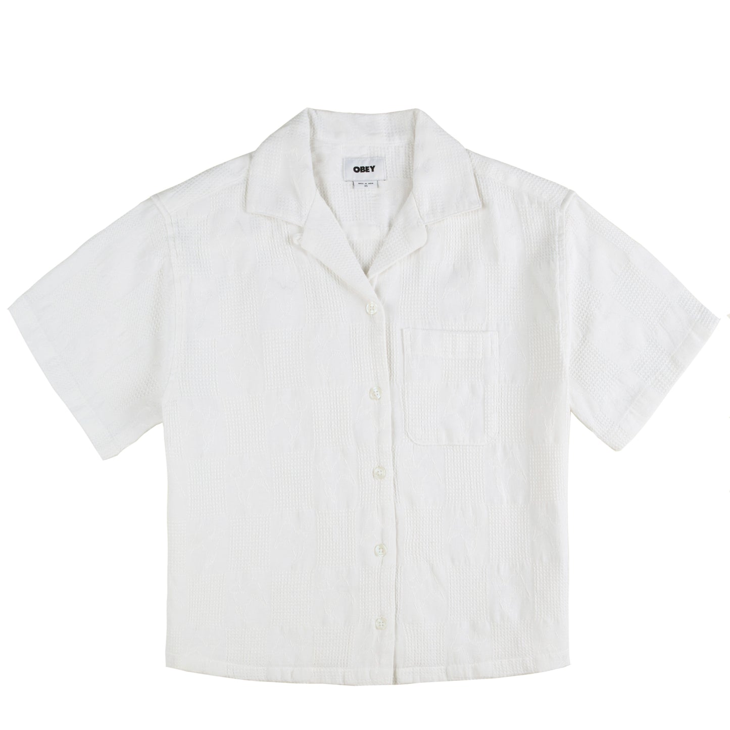 The Obey Women’s Manor Jacquard Shirt in White is a relaxed-fit, cropped short sleeve shirt featuring an all-over jacquard pattern. Made from a soft cotton-polyester blend, it includes a button front, chest pocket, straight hem, and side flag label. Crafted under Fair Trade standards, it combines comfort with standout texture and subtle branding.