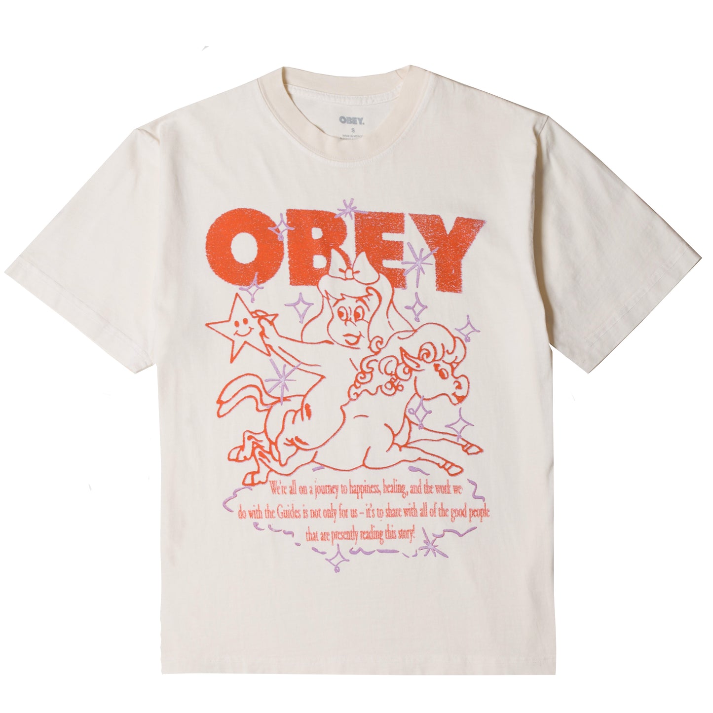 The Obey Women’s Spirit Guide Pigment T-Shirt in Unbleached features a custom graphic on a soft pigment dyed cotton base. With its boxy fit and vintage inspired wash, this tee blends laid back comfort with effortless style, perfect for everyday wear.