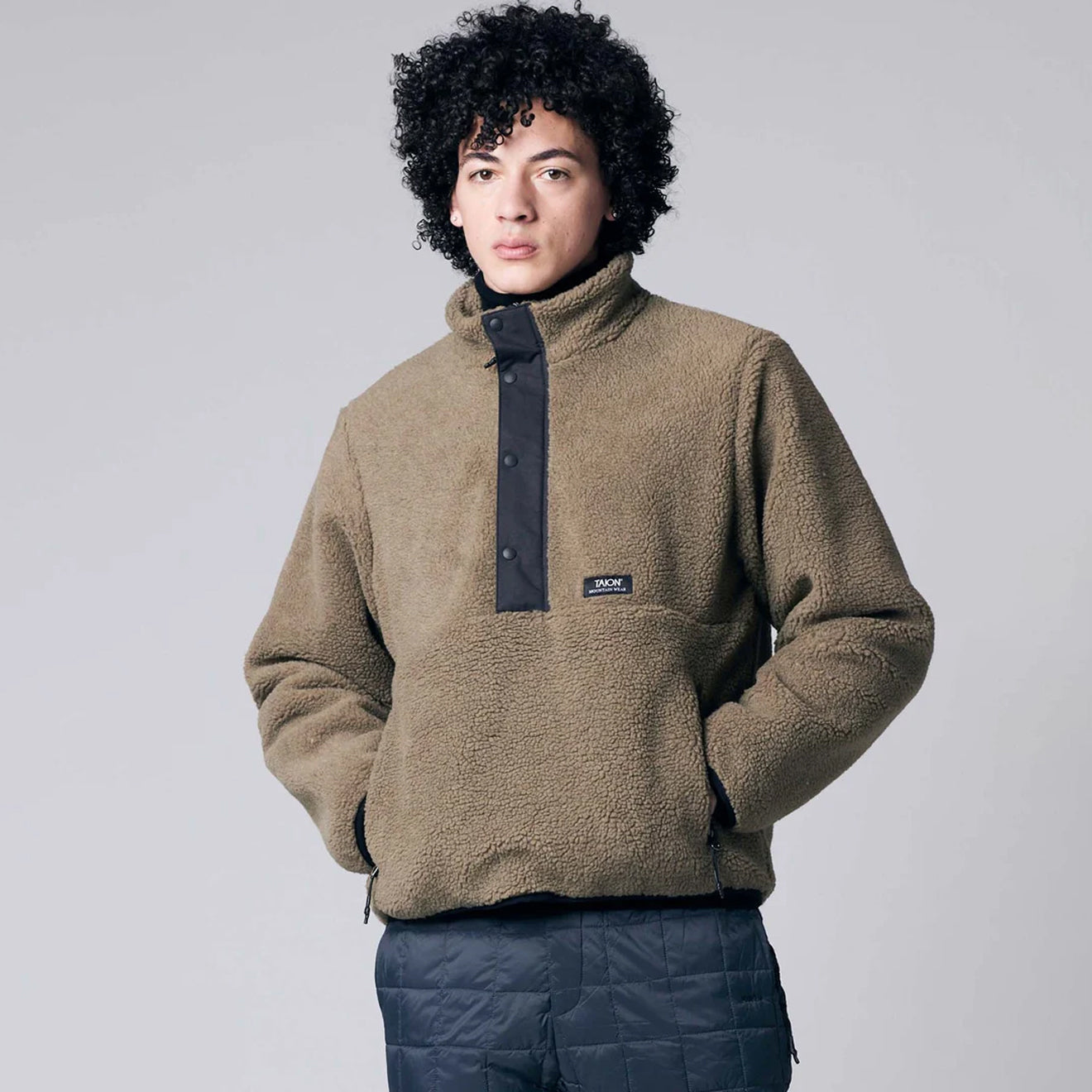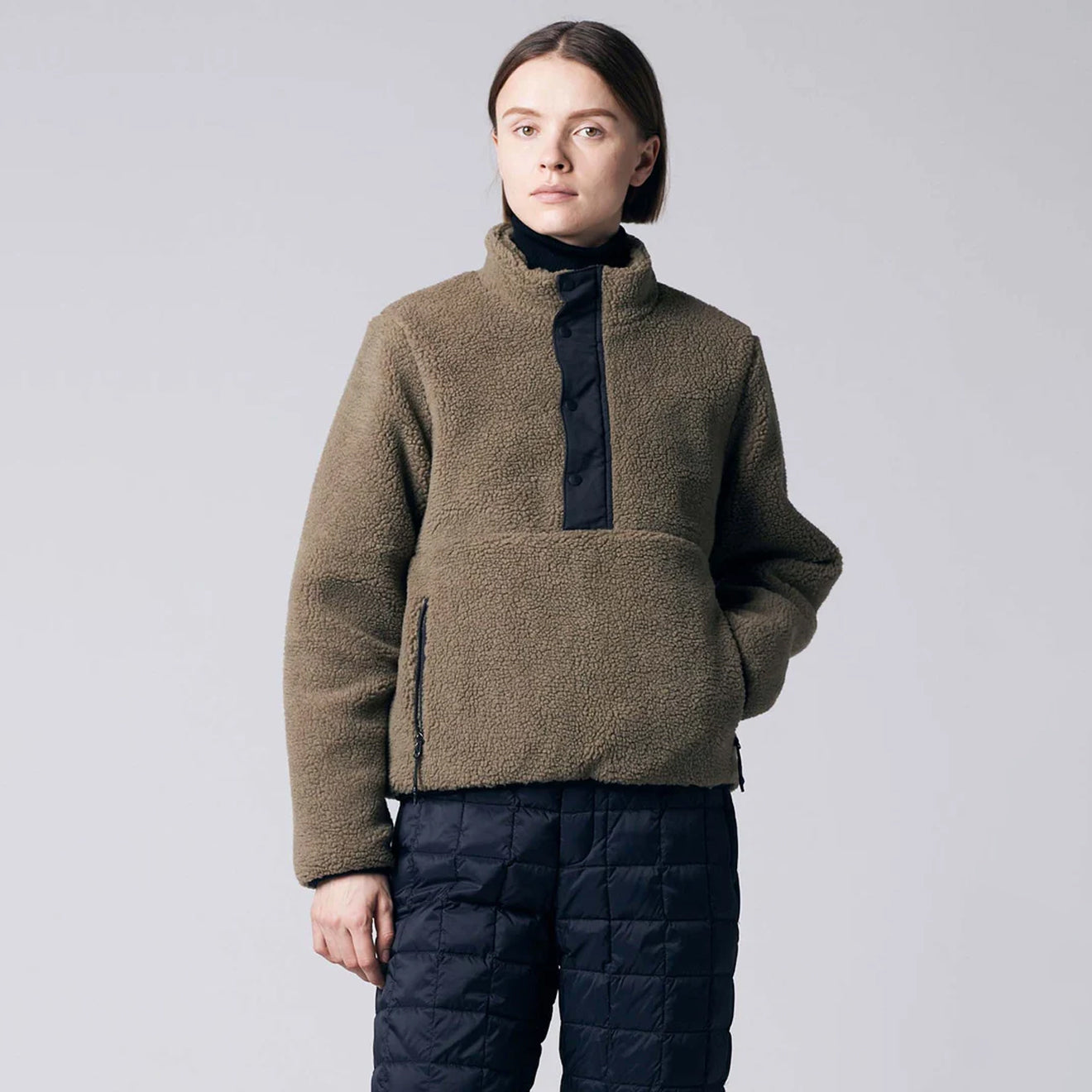 The Taion Womens Pull Over Boa Hi Neck Jacket in Dark Beige / Black provides cosy insulation with a high neckline and a plush boa finish inspired by the Mountain Line series. The relaxed pullover shape and layered construction make it useful for everyday wear, whether used as a lightweight outer layer or under heavier pieces.